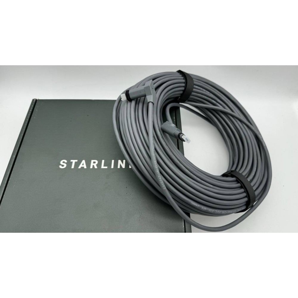 Соединительный кабель Starlink длиной 45,72 метра служит заменой стандартному кабелю в 15 метров, входящему в комплект Starlink, для обеспечения дополнительной дистанции между спутниковой антенной и роутером.